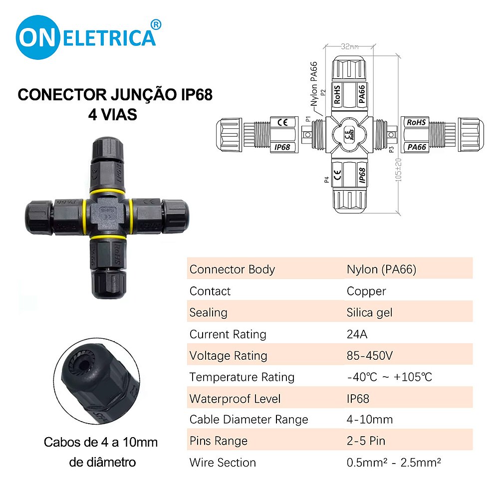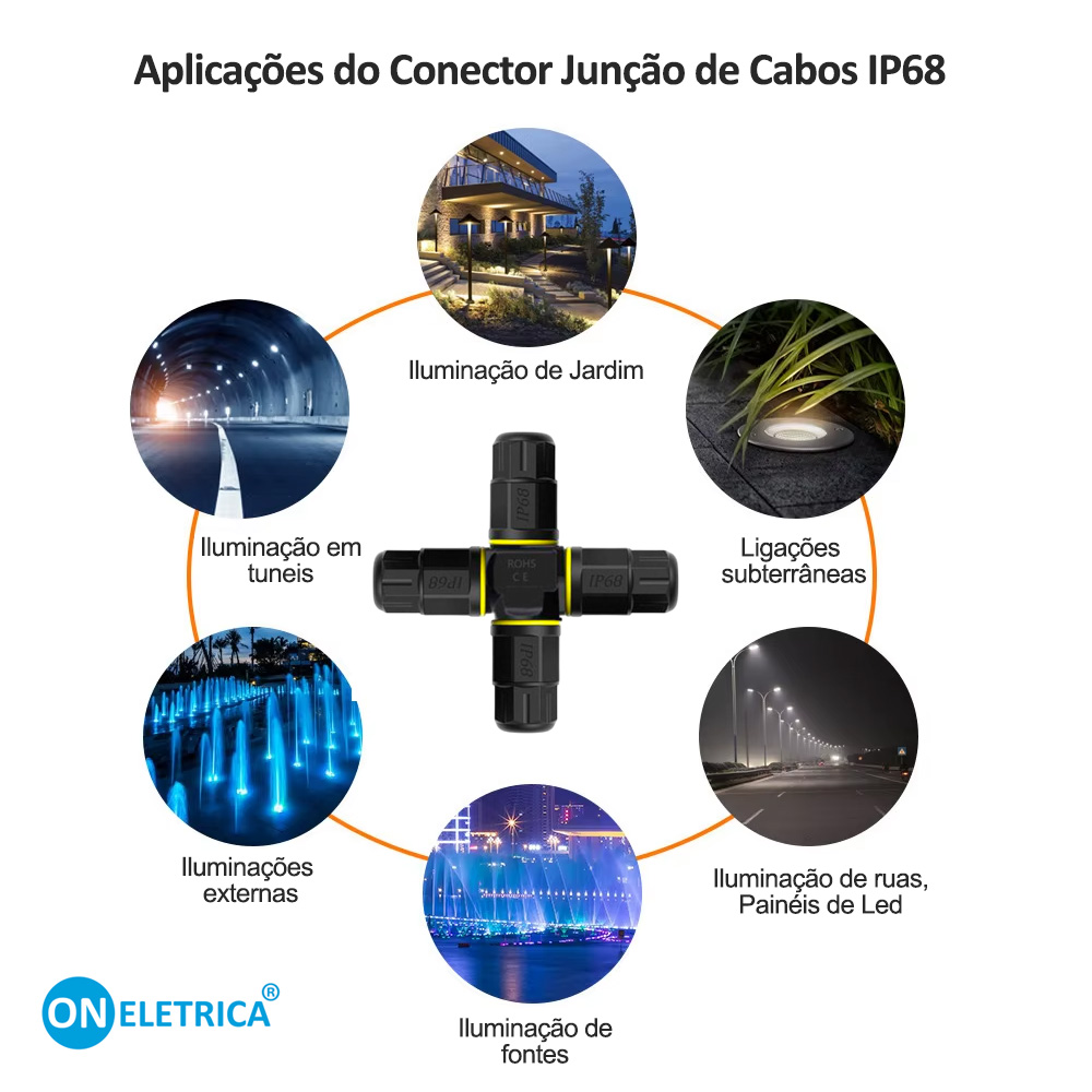 Com suporte para tensão de até 450V e corrente de até 24A, este conector é amplamente utilizado em sistemas de iluminação LED externa, como luminárias de jardim, postes de rua, fontes, túneis e iluminação subaquática. Seu formato em X facilita ramificações e derivações de cabos de forma prática e segura.